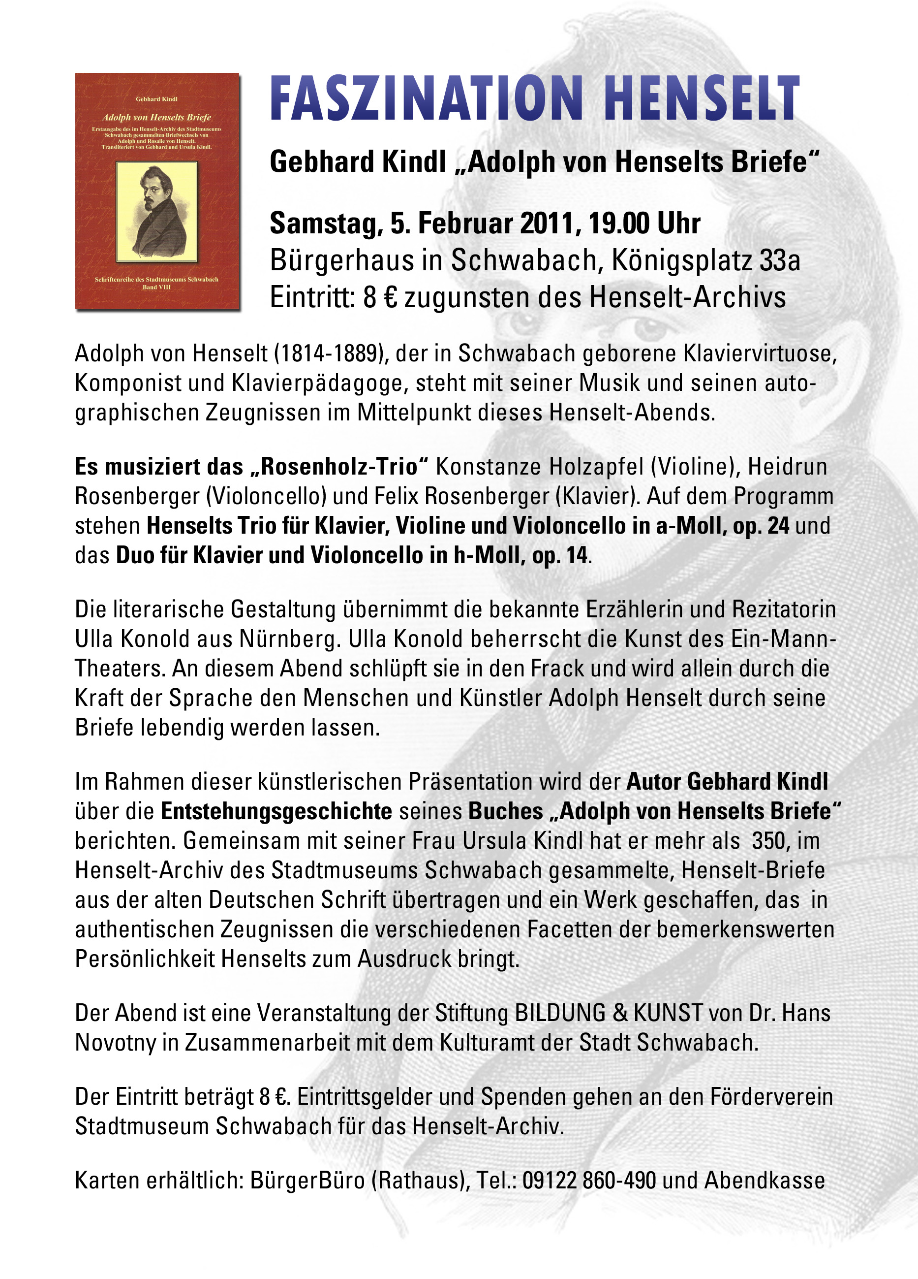 Ich bin dankbar und glücklich. Der Henselt Abend in Schwabach war ein voller Erfolg. Das Haus überfüllt und die Reaktion mehr als nur begeistert. Mir wurde gesagt: Sie haben Henselt lebendig gemacht. Jetzt hoffe ich, dass ich dazu beiteragen kann, dass diese fazinierende Künstlerpersönlichkeit und seine Musik wieder in ein breiteres Bewußtsein kommt.